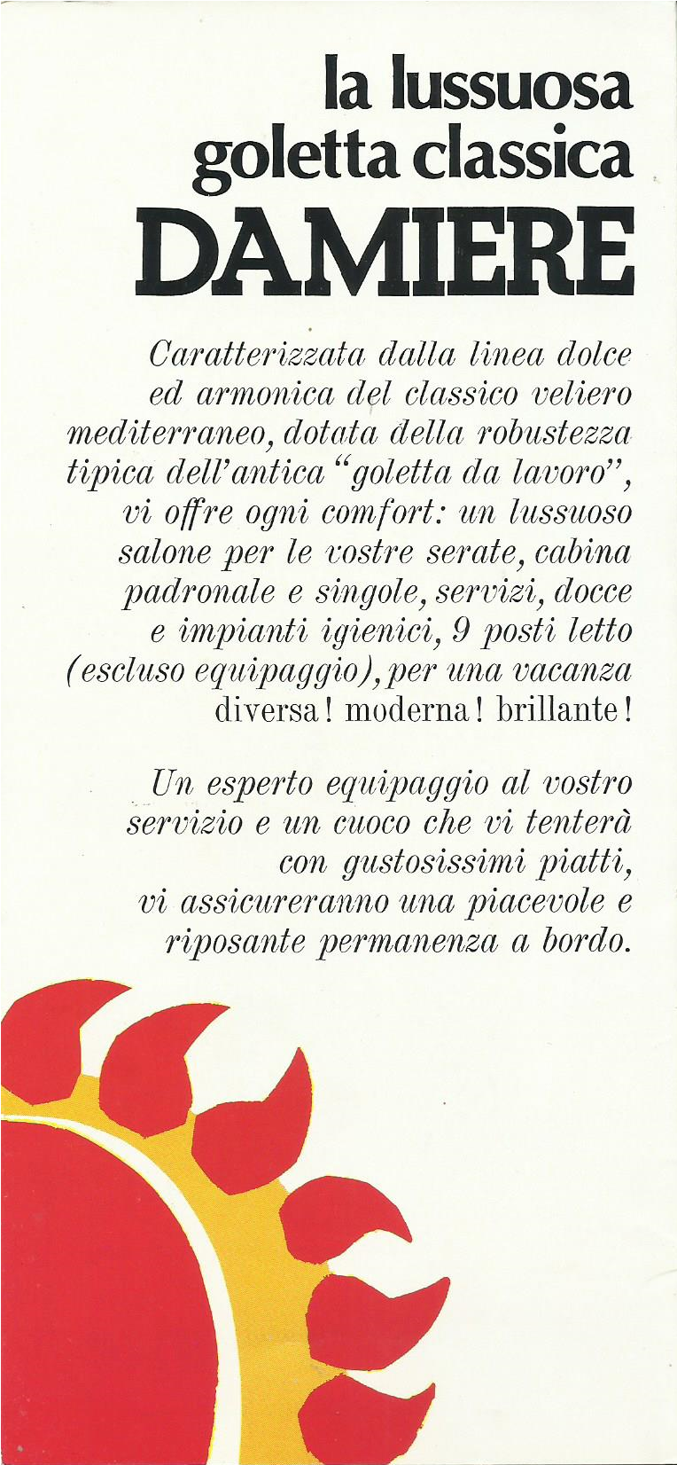 Vari Depliant fronte-retro del Damiere con una piccola descrizione e qualche specifica tecnica della barca.