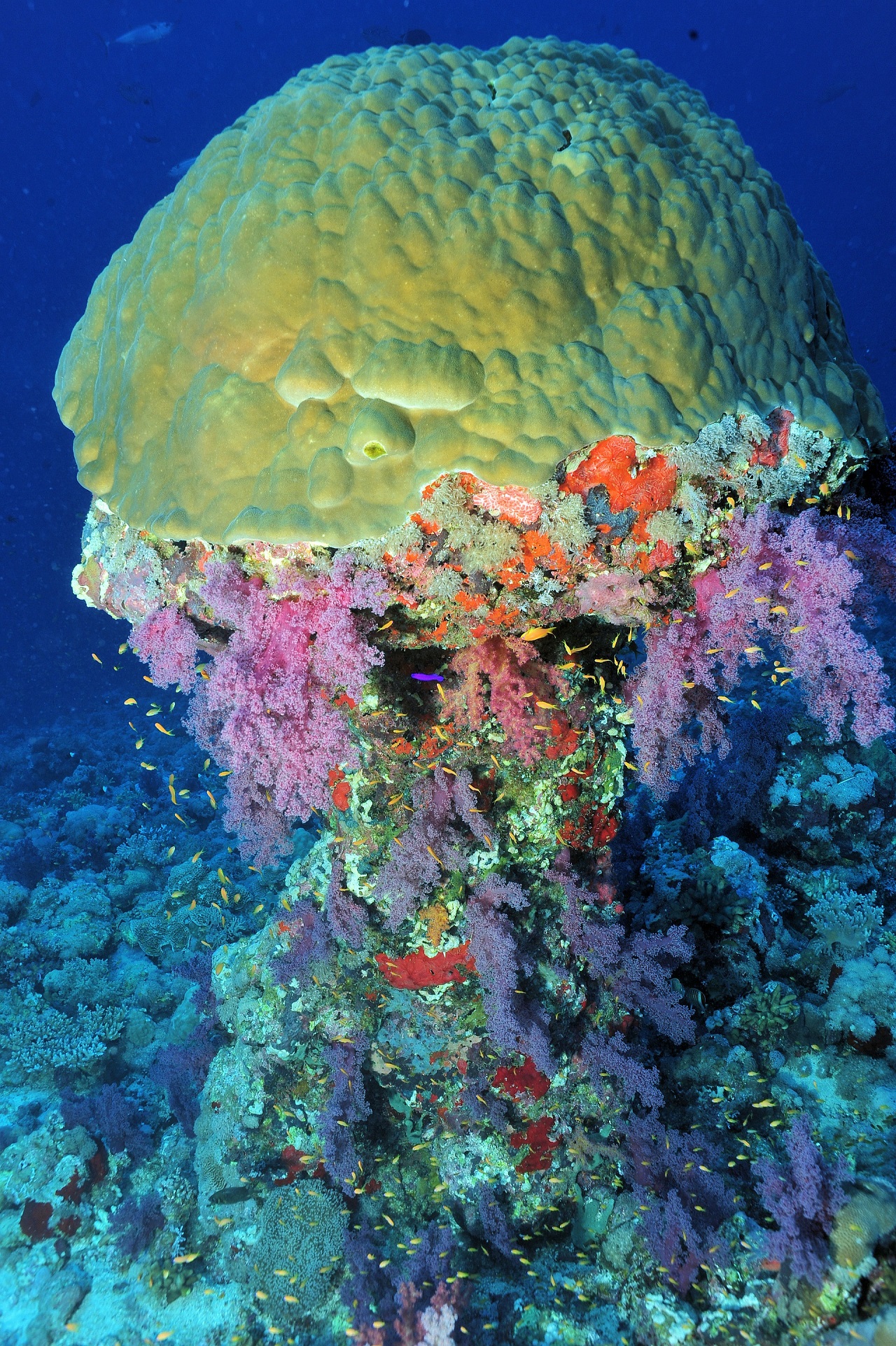 considered one of the best in the world for scuba diving for the beautiful coral formations of which it is completely covered and above all thanks to the rich underwater fauna. a large formation of anemones with clownfish is found close to the reef wall, gray sharks hovering in the blue while schools of barracudas swim by creating beautiful figures.